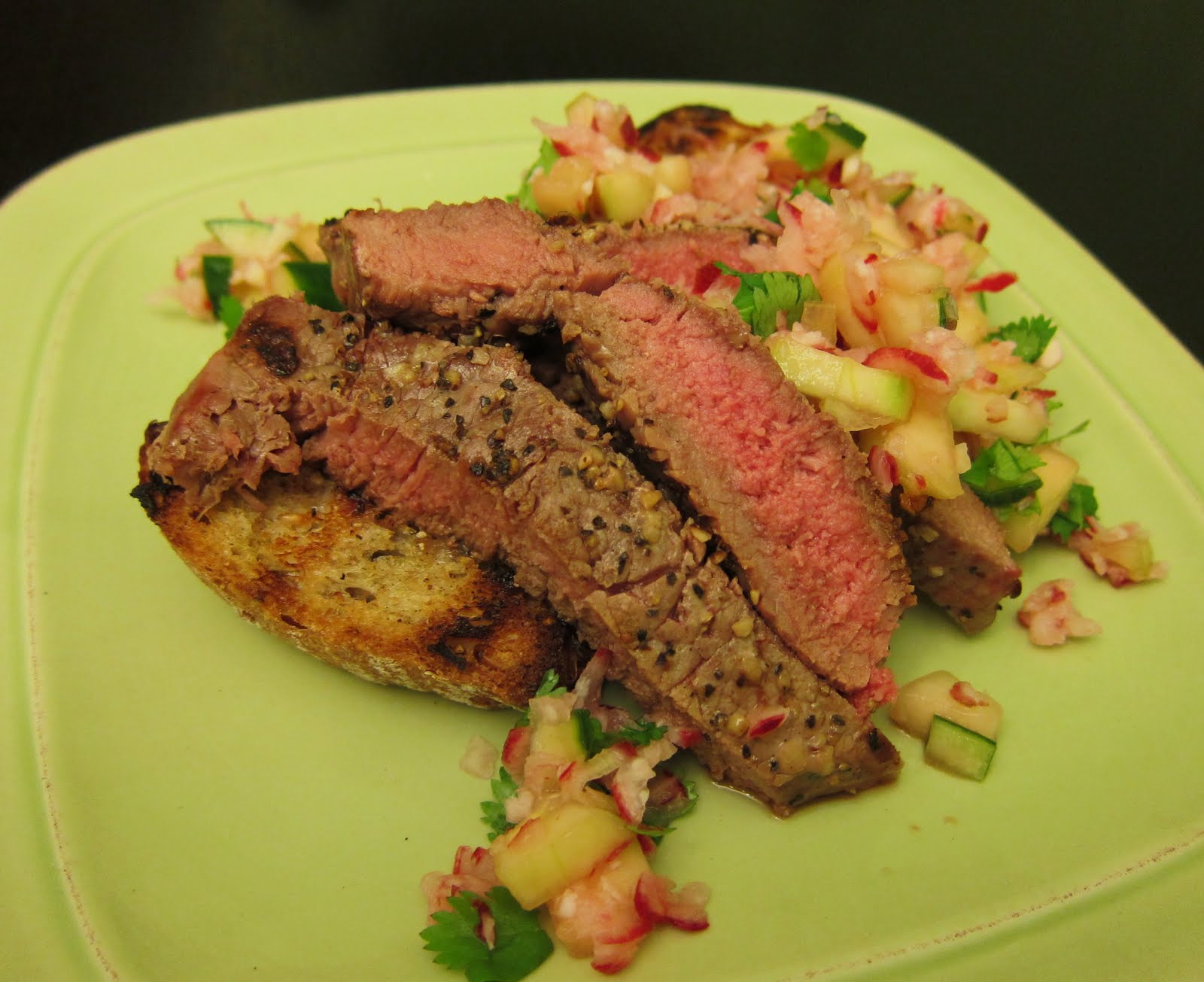 Brush or spray top side of bread with olive oil. Sprinkle with garlic salt, pepper, and oregano to taste. After the steak is removed from grill, place the bread slices seasoned side down on grill. Close lid for 2-3 minutes. Remove and place one bread slice on each of 4-6 plates (depending on how many you are serving). Slice steak and arrange on bread slices then top with radish salsa. So fresh and flavorful, this might be our favorite new way to eat steak in the summer!