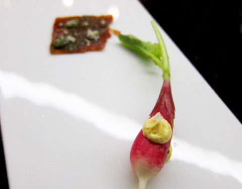 Our 1st course at The Catbird Seat: Baby Radish with Uni Butter, Hot Chicken Skin, Porcini Mushroom Oreo with Parmesan Cream Sitting at the 30 person counter within the sanctuary that is The...