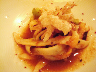 Now to the fun part- the menu. I’ve included a smattering of notes and photos, which unfortunately do not do the food justice. No flash photography was allowed and I’ve never gotten around to deciphering all the little buttons on my camera that would probably help in such a situation. I also need to apologize for getting lost in the moment a few times, and devouring my food before snapping a pic.