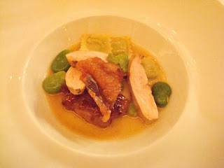 Both dark and white meat with a crispy skin on fava bean raviolini in a light sauce. This is the point at which Tom was dubbed the “King of Sauces”.