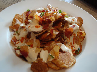 freshly made chips topped with blue cheese dip, bacon and green onions